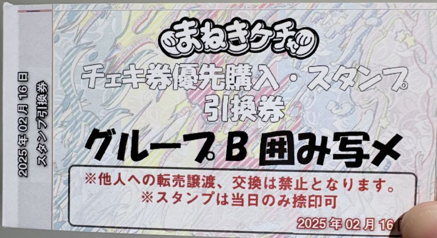 17:30に会場に到着しました。今回の入場特典はランダムグループ囲み写メというものでした。グループAとBの券が交互に束ねてあり、上から渡されました。私はグループB。さて、どのメンバーでしょうか。