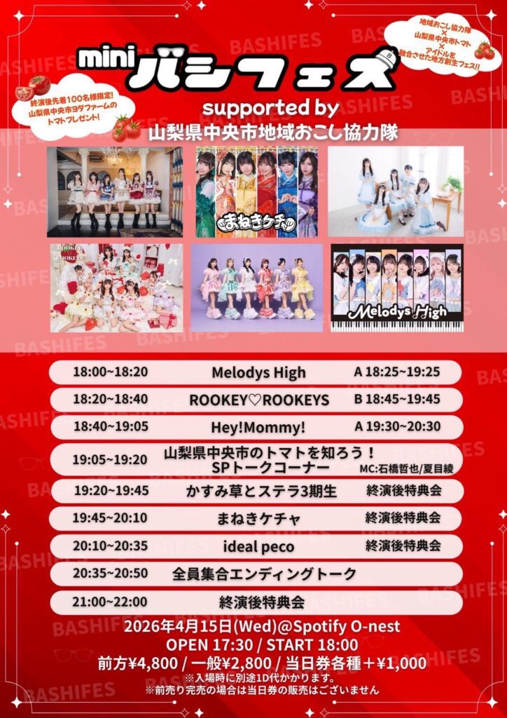 まねきケチャ|20260415_miniバシフェス supported by 山梨県中央市地域おこし協力隊@Spotify O-nest【トマトのプレゼント】