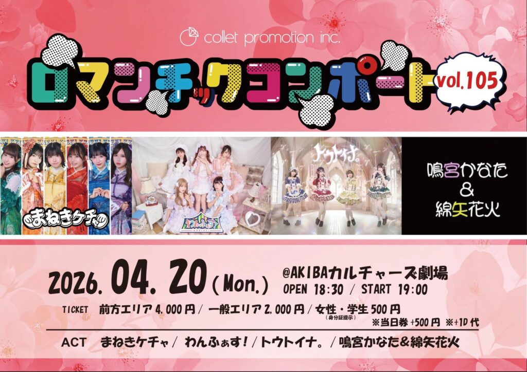 2026年4月20日(月)に行われた「ロマンチックコンポートvol.105」に参加しましたのでレポートします。ロマンチックコンポートはコレットプロモーションが主催する対バンイベントで、主にコレットプロモーション所属のグループが出演します。今回は、すべてコレットプロモーションに所属するトウトイナ。、鳴宮かなた・綿矢花火、わんふぁす!、まねきケチャが出演しました。