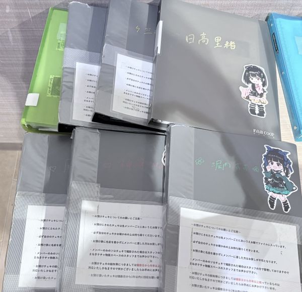 宿題チェキはメンバーがコメントを書き終わり次第、物販コーナー横に設置されているお預けファイルに名前順に「あいうえお順」で格納されます。格納される時期は3~4週間が目安です。「サインお預け券」に記入した名前順にファイリングされています。