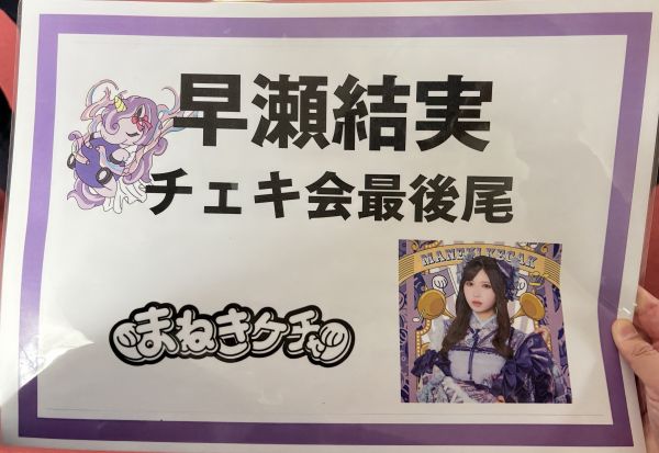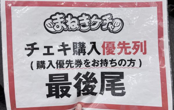 対バンでは、入口で目当てのグループとしてまねきケチャを選択した場合にもらえる「チェキ券優先購入・入場スタンプ引換券」を持っている人から優先的にチェキ券を購入することができます(優先購入)。優先購入する場合は「チェキ券購入優先列」のプラカードを目印に列に並びます。持っていない場合は、購入優先列が途切れた後に購入します。なお、チェキ券は売り切れることはないため、優先購入でなくても希望のメンバーのチェキ券を購入することができます。