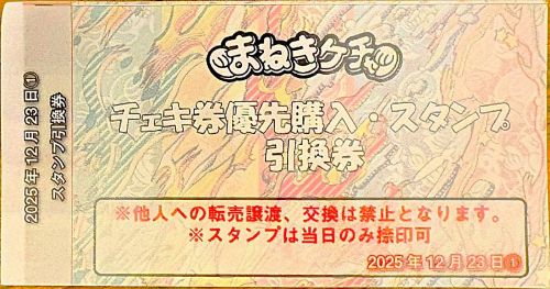 対バンでは、入口で目当てのグループとしてまねきケチャを選択した場合にもらえる「チェキ券優先購入・入場スタンプ引換券」を持っている場合に限りポイントカードにスタンプを押してもらうことができます。なお、Tokyo Idol Festivalや@JAMなど、大規模な対バンイベントでは、入場時にお目当てのグループを聞く余裕がないため、入場スタンプ引換券はもらえません。そのため、まねきケチャの公式Tシャツの着用が求められる場合があります。必ずXの公式アカウントで確認しましょう。